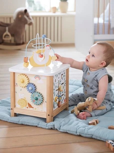 Un cube d’activités en bois taille XL qui ne manque pas d’idées pour éveiller et émerveiller bébé ! 5 faces plus intrigantes les unes que les autres, avec sur le haut du cube, un boulier et ses 2 circuits de perles, qui peut se retourner pour fermer la boite. Sur les 4 faces : une face engrenages, une face animaux à encastrer, une face “musique” avec un bouton à tirer et une roulette avec grelots à l’intérieur, et une face avec des palets à déplacer ! Ce grand cube d’activités promet de jolies découvertes à votre bébé !