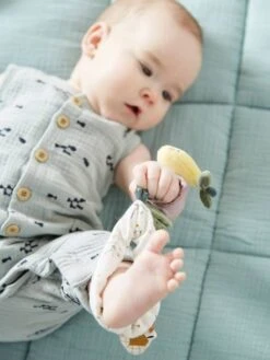 - 1 hochet pied rose avec yeux, joues brodées et feuilles en volume + 1 hochet pied imprimé fleur avec cigale à grelot et feuilles en volume