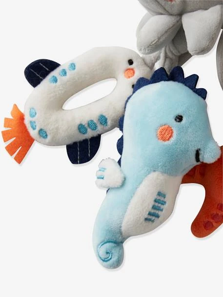 - 5 jouets détachables par scratch : 1 étoile de mer à billes, 1 hippocampe pouet, 1 poisson à billes, 1 poisson en volume, 1 poisson attache tétine.