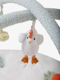 - Jouets sur les arches : un anneau transparent avec billes de couleurs, 1 poussin avec ailes volantes et anneau + feuilles en volume, 1 poule avec ailes volantes, 1 pomme avec pouet et 1 fraise avec broderies